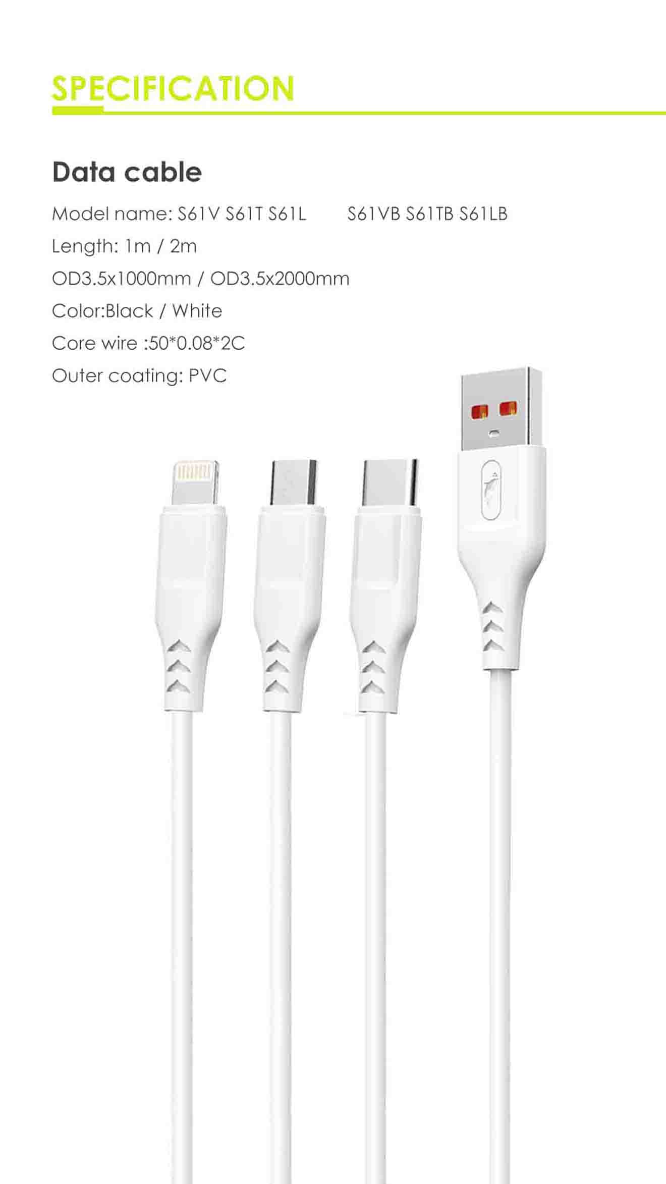1. Length: 1m, weight:28g 2. Size: 3.5x1000mm 3. Connector Surface: PVC 4. Core wire : 43x0.08x2C+10x0.08x2C 5. Support charging and sync 6. Maximum current: 2.4A