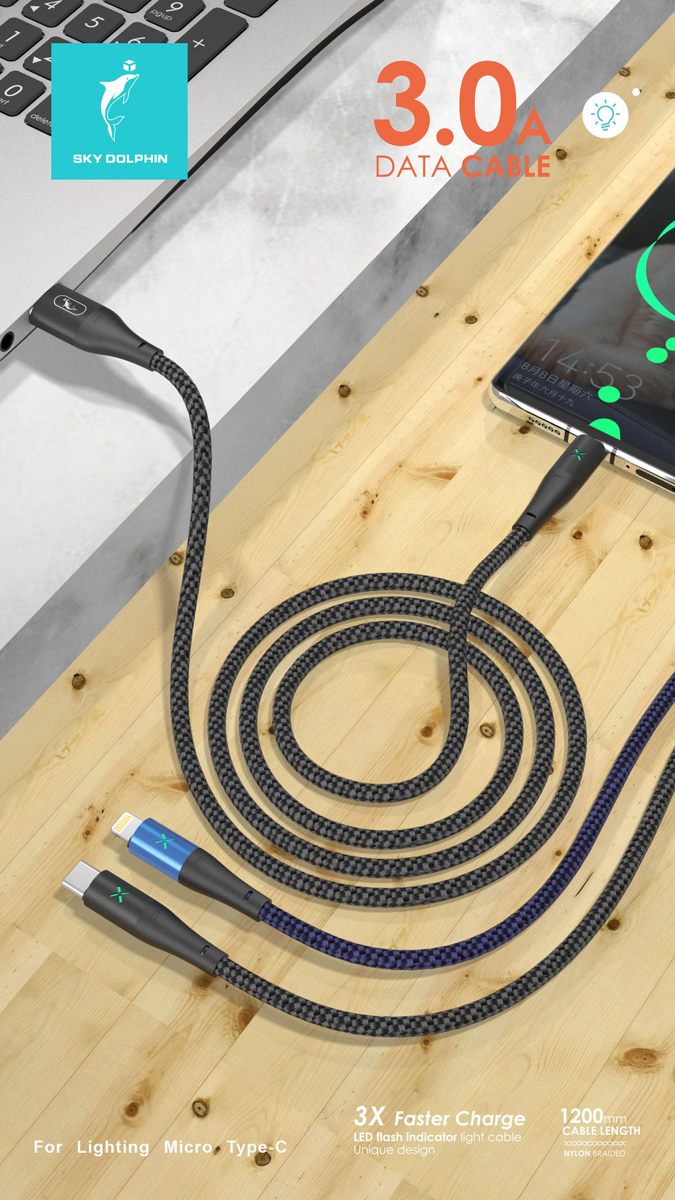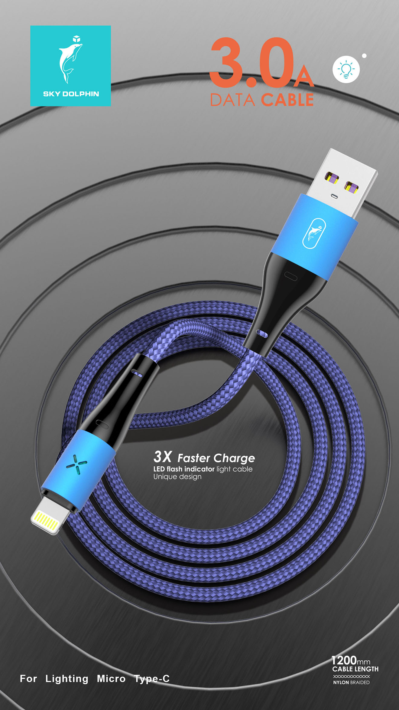 1. Length: 1m, weight:24g 2. Size: 3.5x1000mm 3. # 24 awg pure copper 4. Core wire : 50x0.08x2C+16x0.08x2C 5. Support charging and sync 6. Maximum current: 3A 7. Technology: thread braid, aluminum alloy housing with lamp