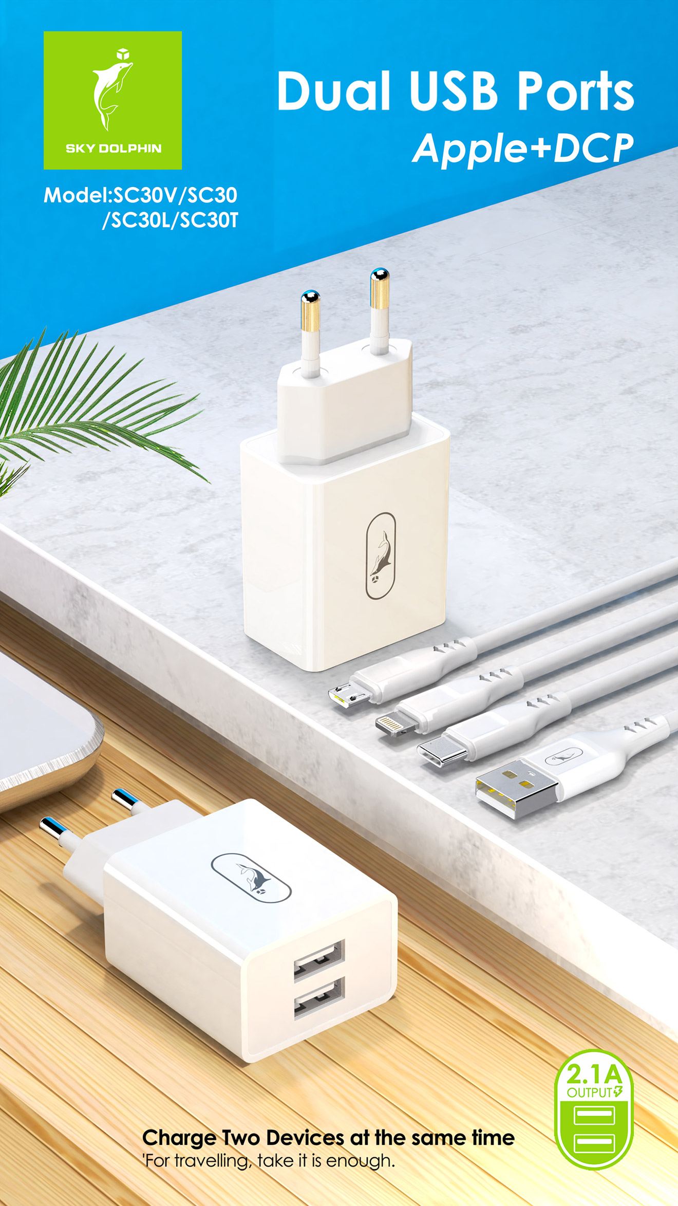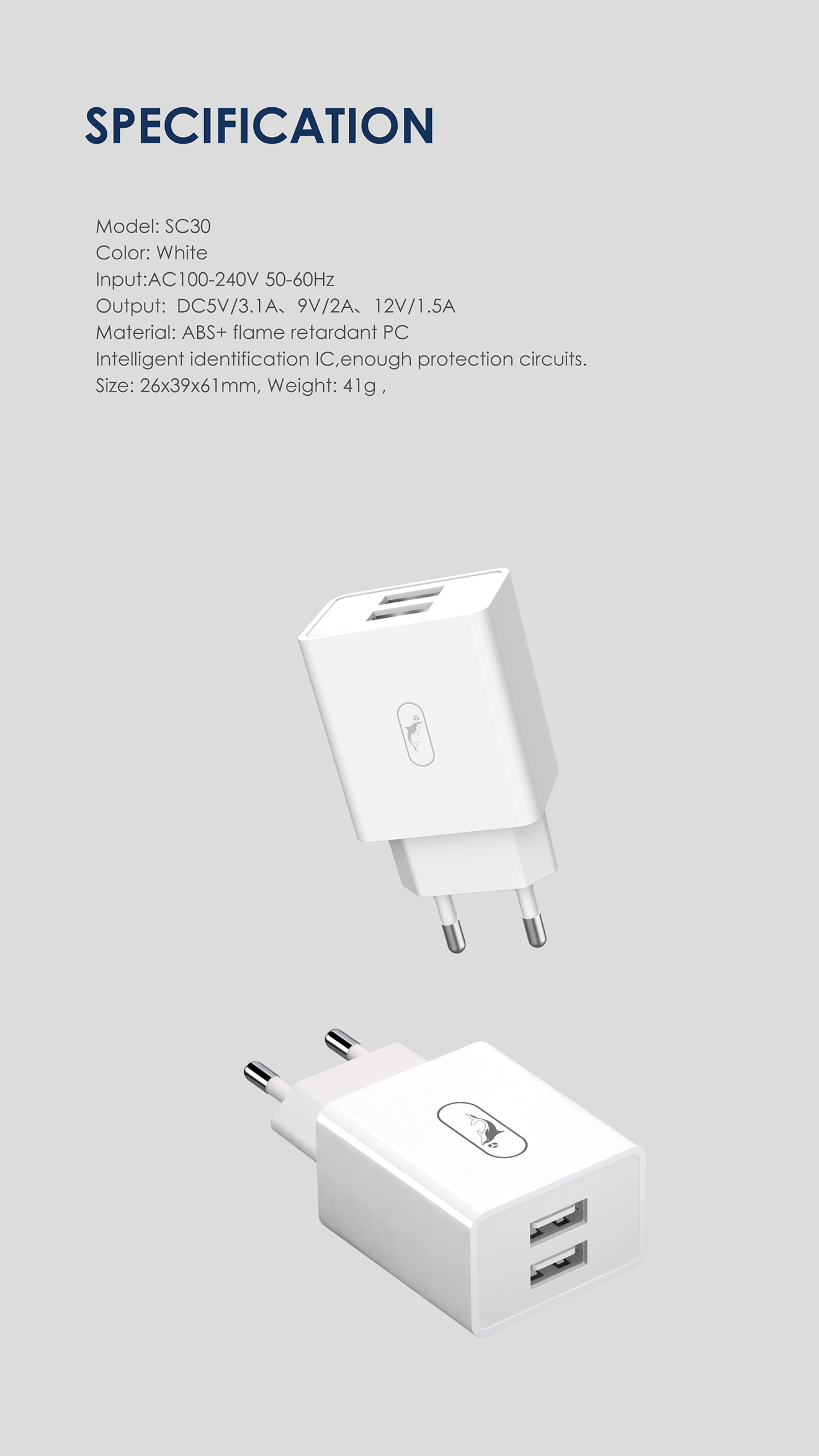 EU USB charger 1. Input:AC100-240V 50-60Hz 2. Output: DC5V /2.1A 3. Material: ABS+ flame retardant PC 4. EU Plug 5. Intelligent identification IC,enough protection circuits.
