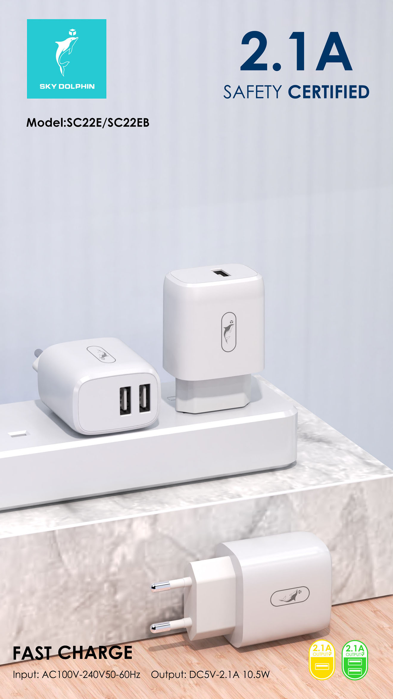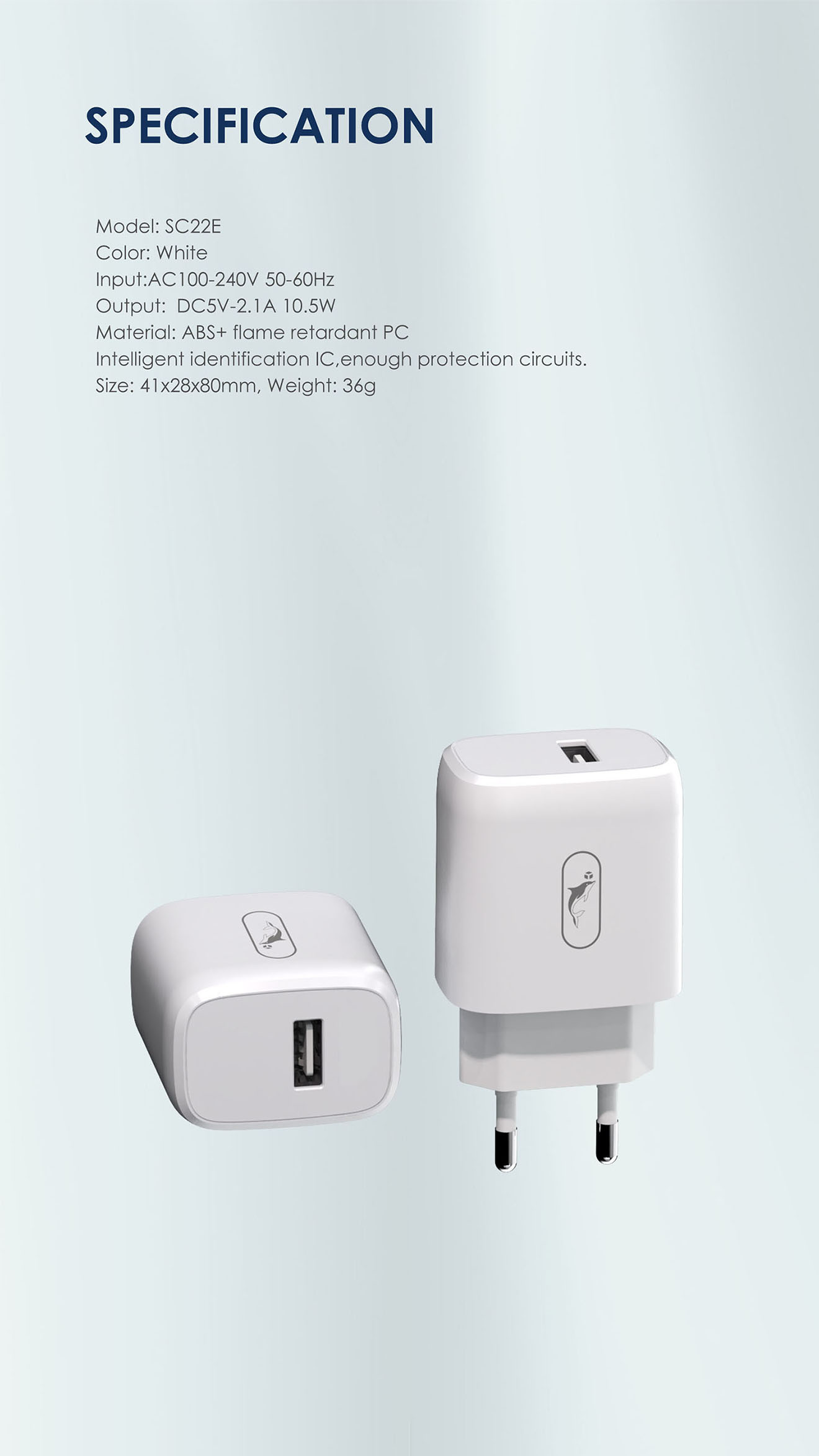 1. Input:AC100-240V 50-60Hz 2. Output: DC5V /2.1A 3. Material: ABS+ flame retardant PC 4. EU Plug arger 5. Intelligent identification IC,enough protection circuits.