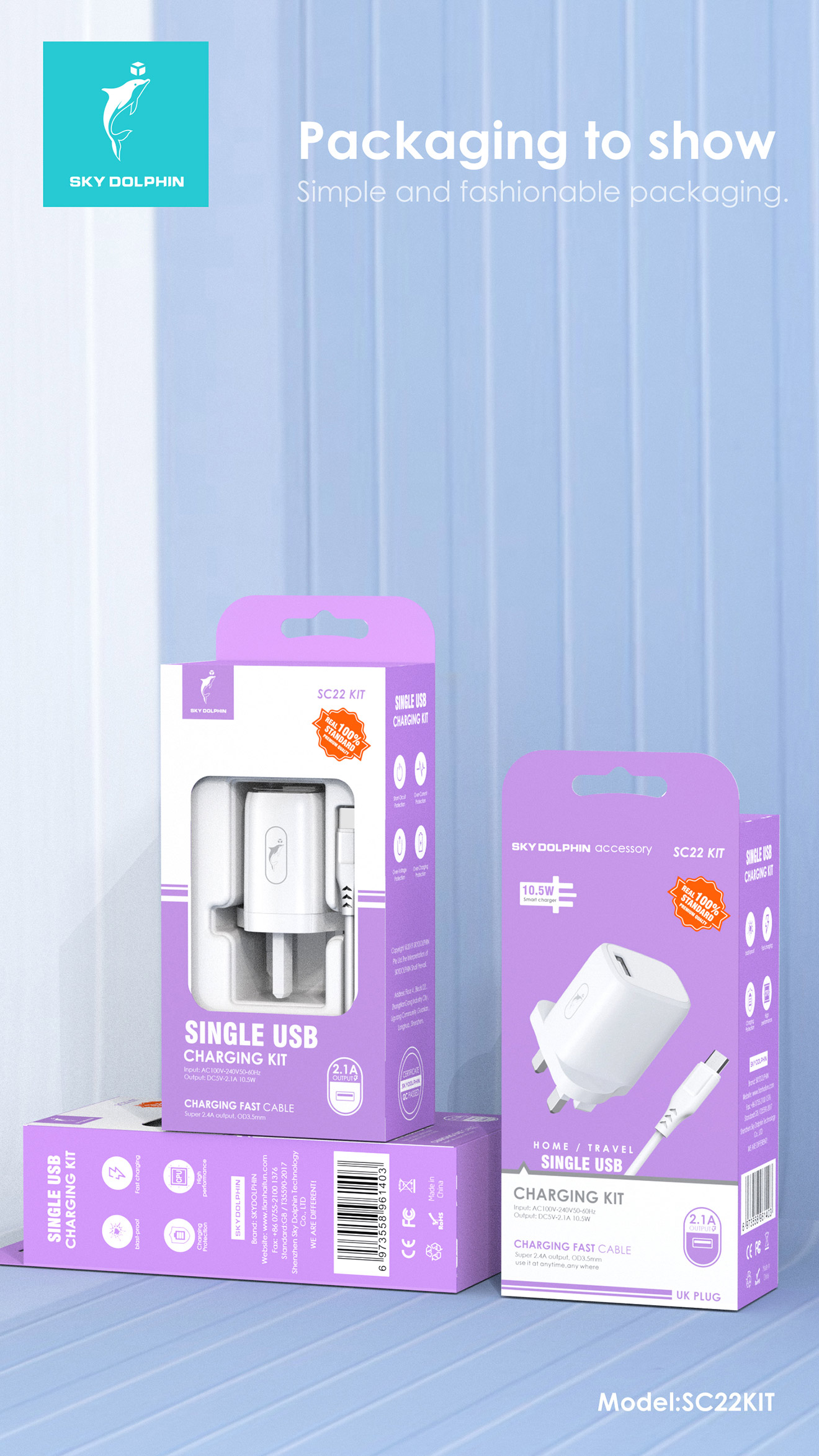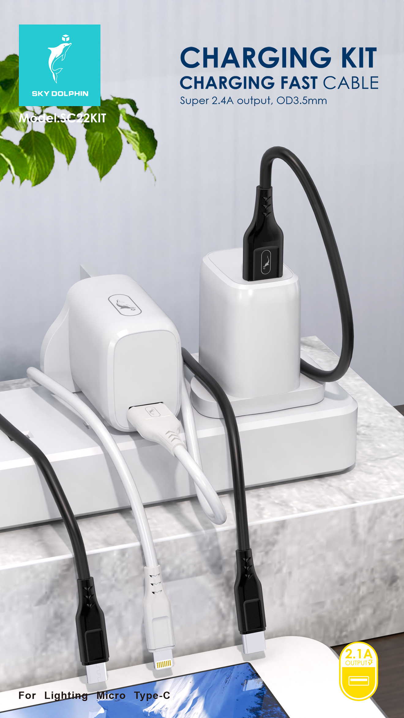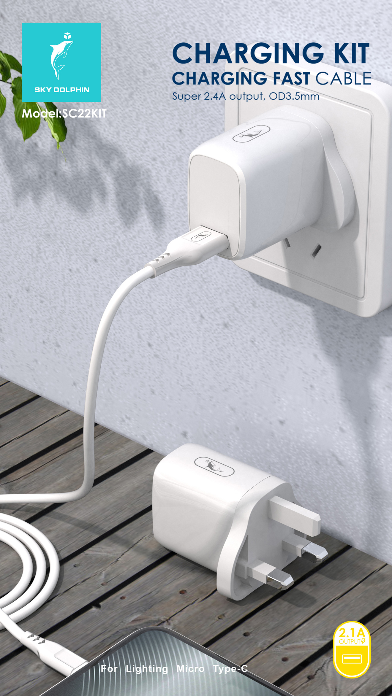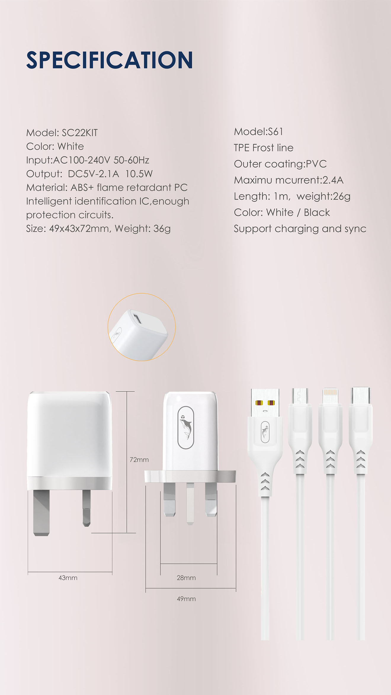 SC22 single USB charger with S61L, S61V and S61T cables 1.Input:AC100-250V 50-60Hz 2.Output: DC5V/2.4A 3.Material: ABS+flame retardant PC 4.Weight:cable 24g+ charger 32g 5.Intelligent identification IC, enough protection circuits. 6.OD3.5*