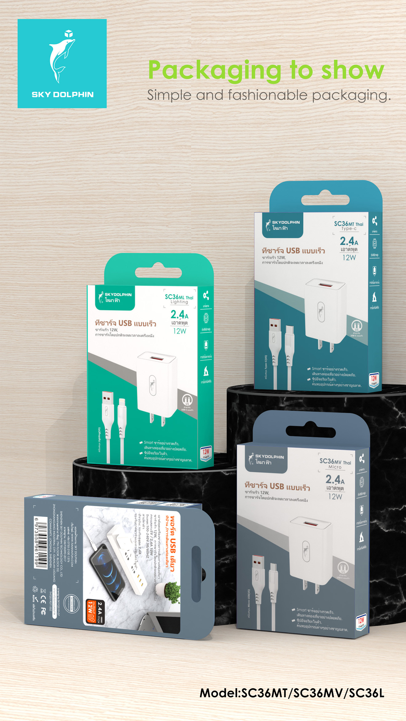 Model: SC36M Input:AC100-250V 50-60Hz Output: DC5V/2.4A Material: ABS+flame retardant PC Weight:cable 24g+ charger 33g Intelligent identification IC, enough protection circuits. OD3.5*1000mm 2.4A Model:S61 TPE Frost line Outer coating:PVC