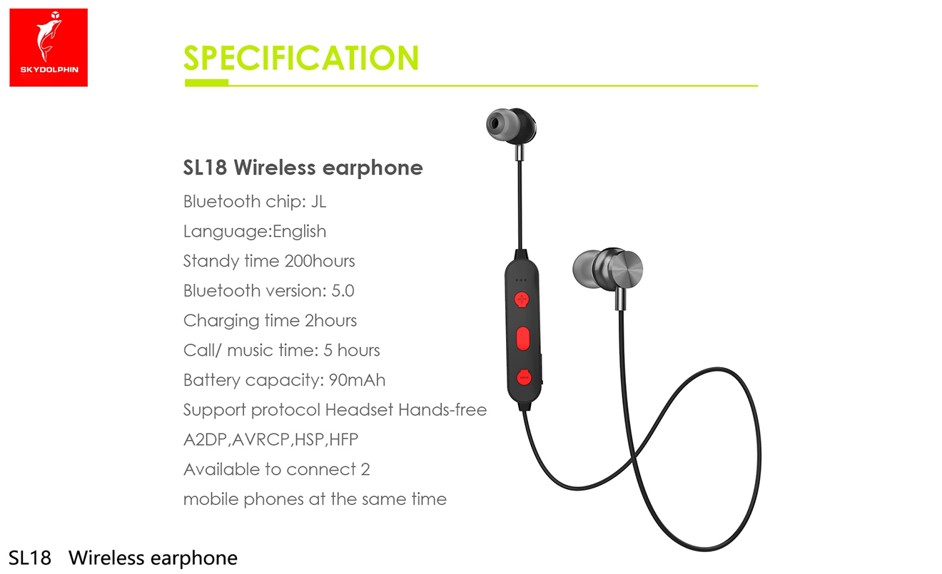 1. Bluetooth chip: JL, Bluetooth version: 5.0 2. Battery capacity: 90mAh, charging time 2hours 3. Call/ music time: 5 hours, standy time 200hours, 4. Weight: 12g , Language:English 5. Ear-hook design like Apple style 6. Support protocol Head