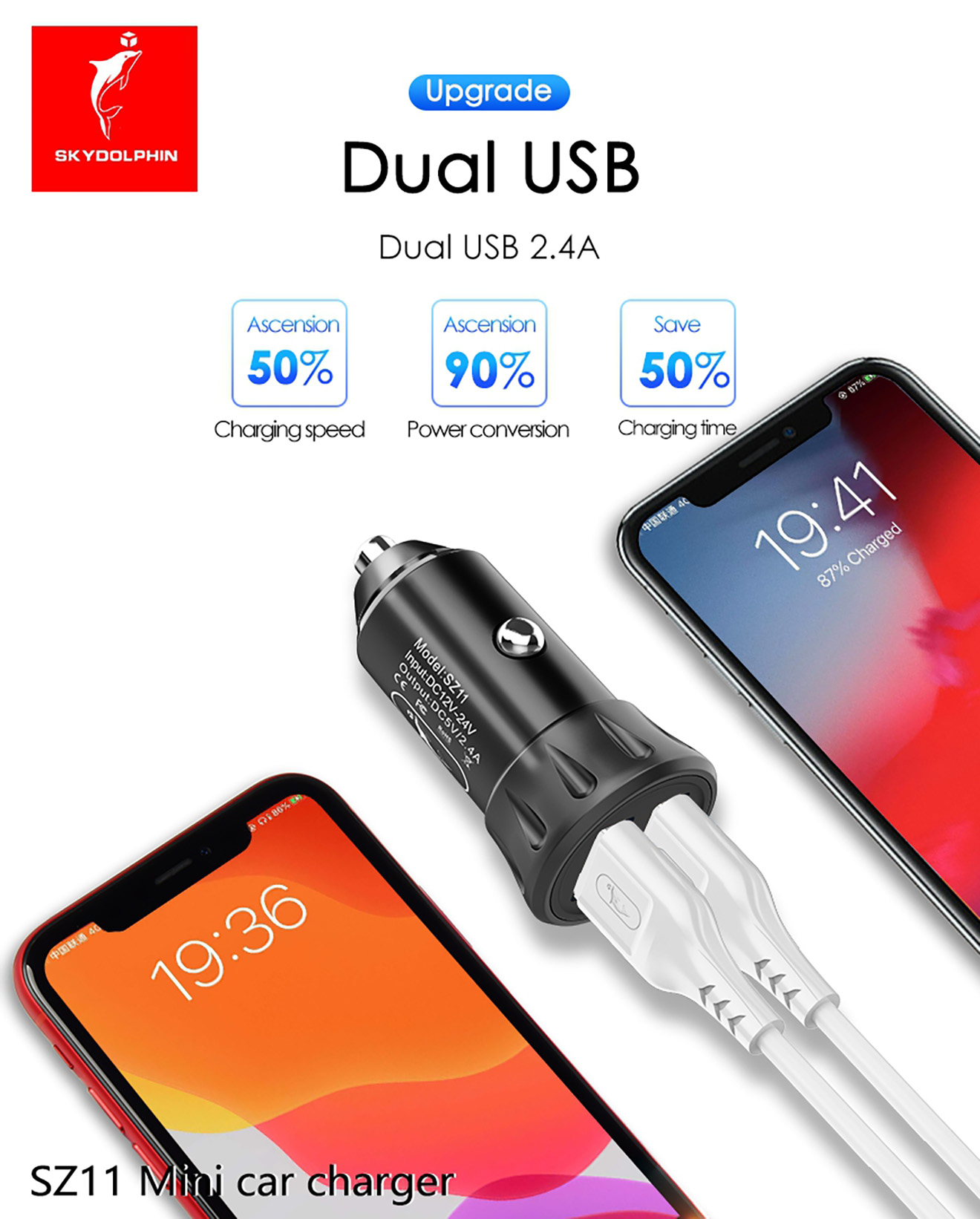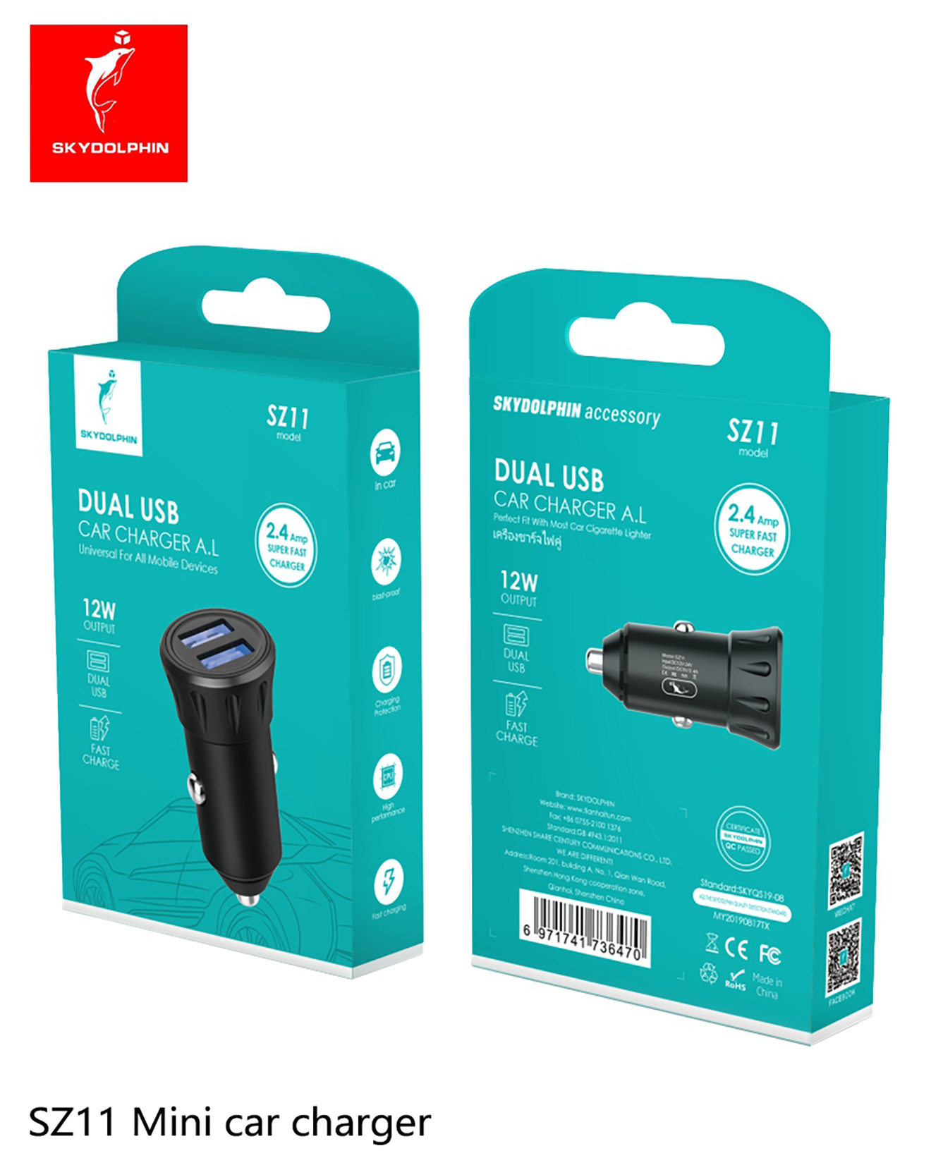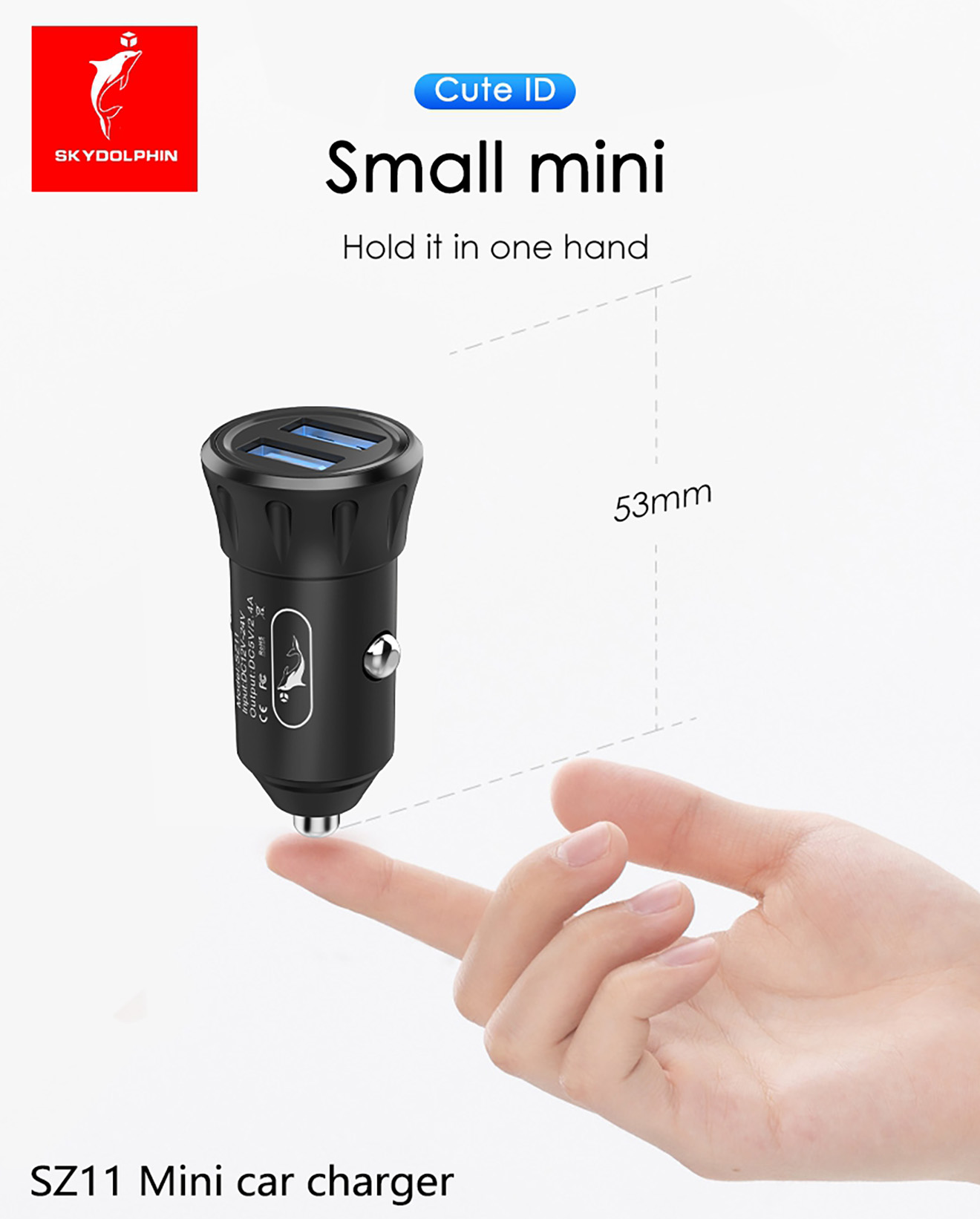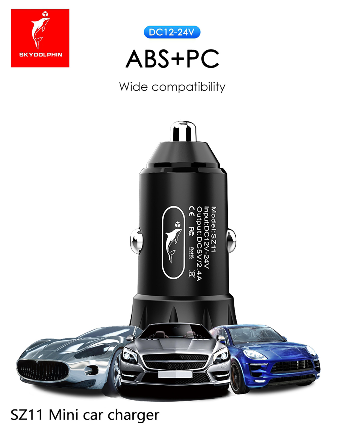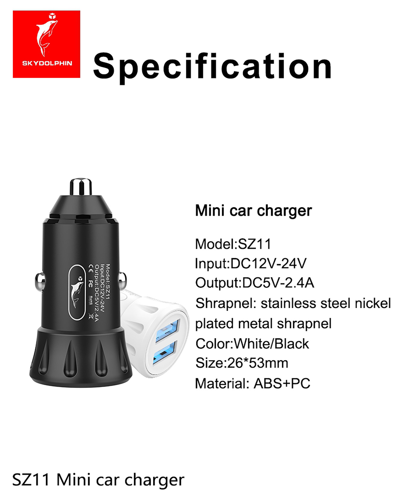 1. Material: PC + ABS 2. Input: DC12-24V 3. Output: 5V/2.4A(12W),Dual USB output 4. Multiple circuit protection 5. Length * Diameter: 26*53mm ,weight: 15g 6. Overcurrent and overvoltage protections for the circuit;