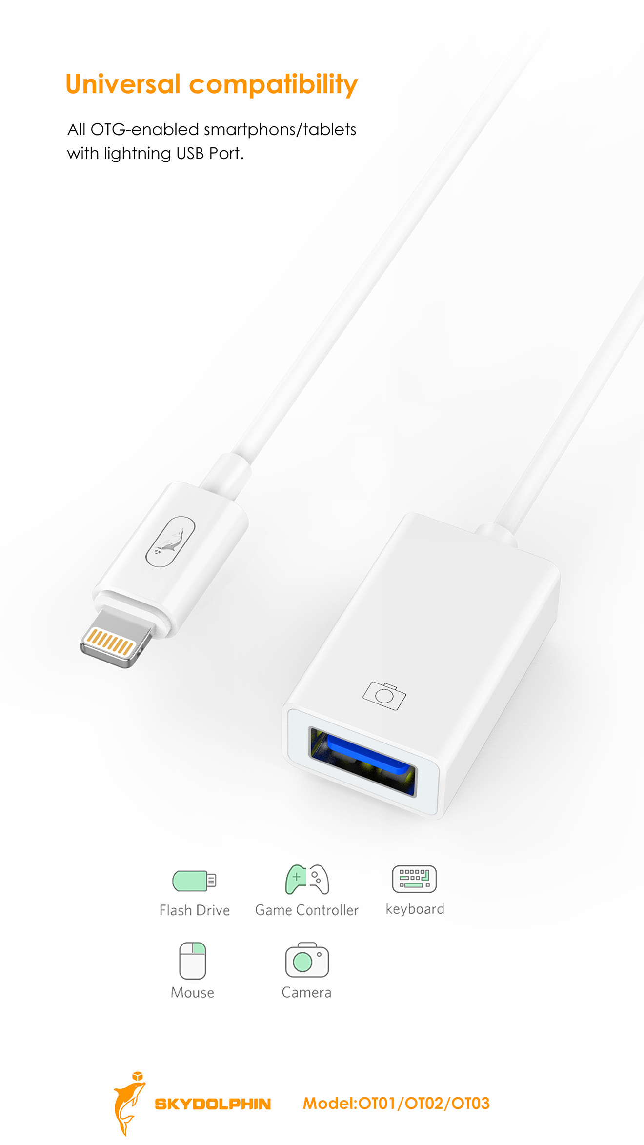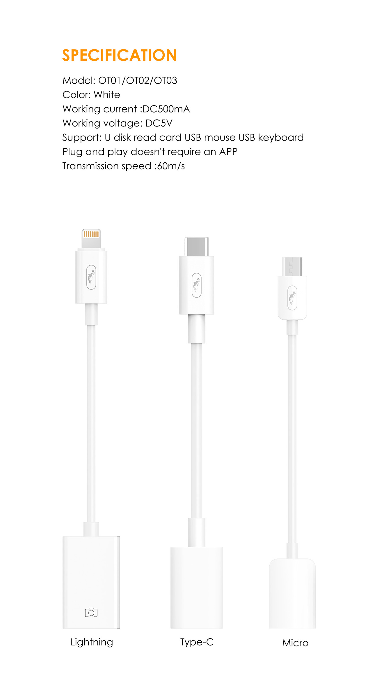 Color: White Working current :DC500mA Working voltage: DC5V Support: U disk read card USB mouse USB keyboard Plug and play doesn't require an APP Transmission speed :60m/s Type-c OTG