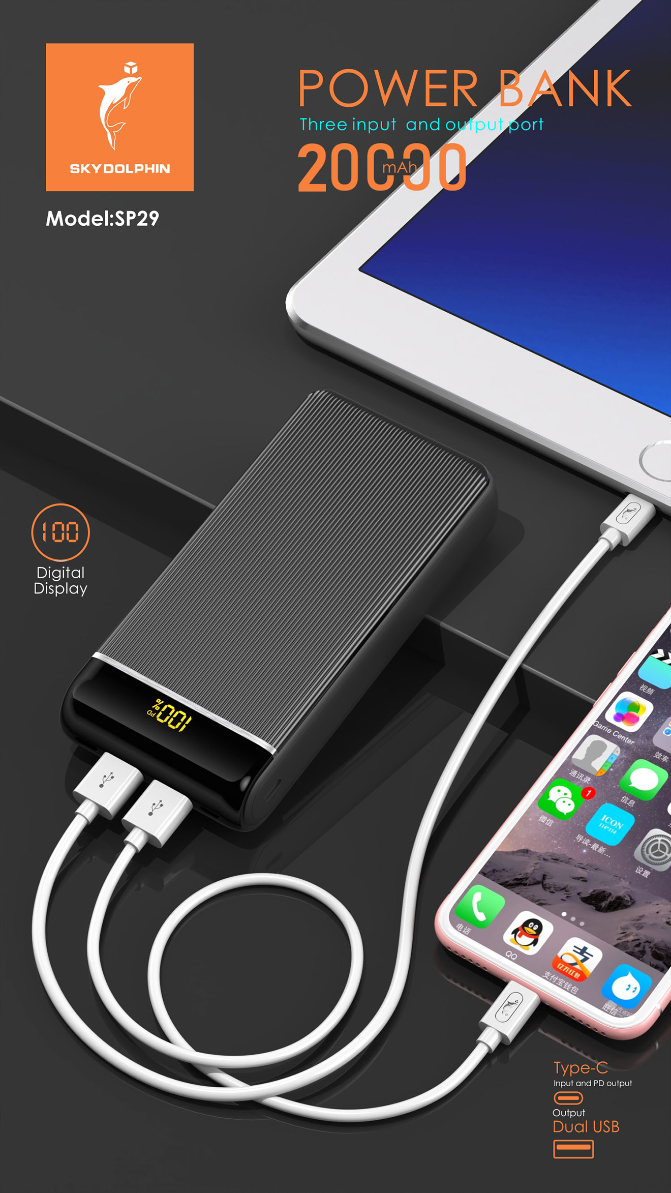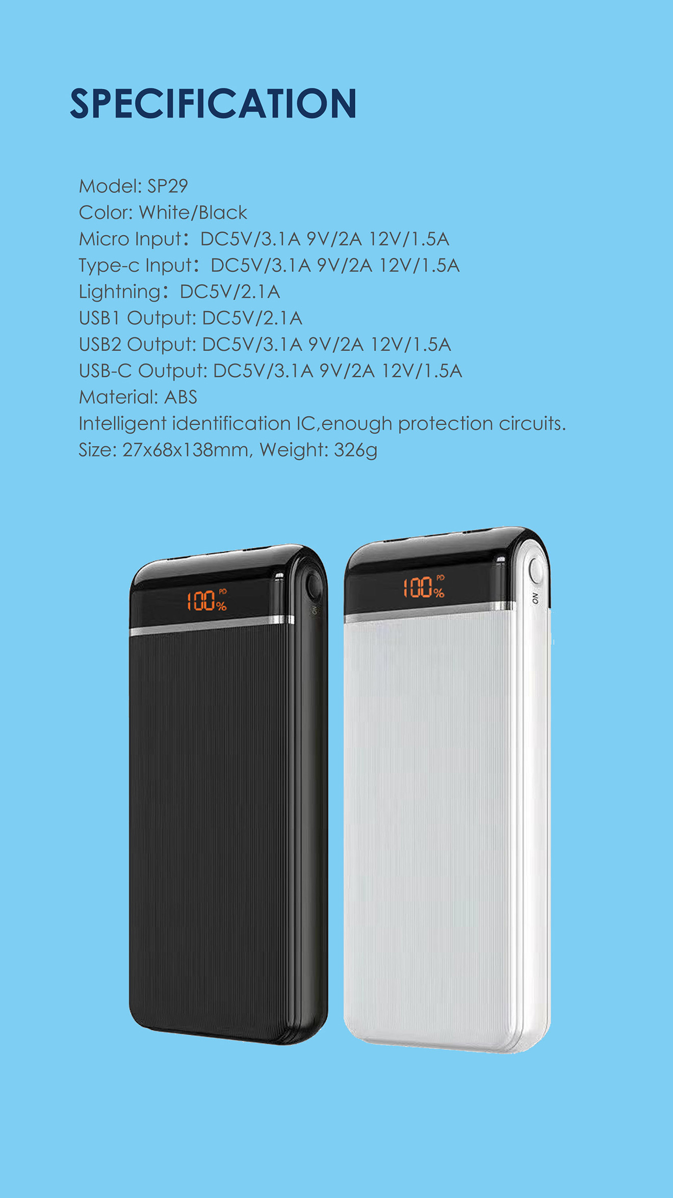 1.Capacity :20000mAh/ 74Wh 2.Input: DC5-12V/1-3A, Micro /Type-c/Lightning 3.Output USb1:5V/3.0A/9V/2A、12V/1.5A 4.USB2Output : DC5V/2.1A, 5.Type-c Output:5V/3.0A/9V/2A、12V/1.5A 6.Battery: Energy-efficient A+ polymer 7.Material: ABS+PC fla
